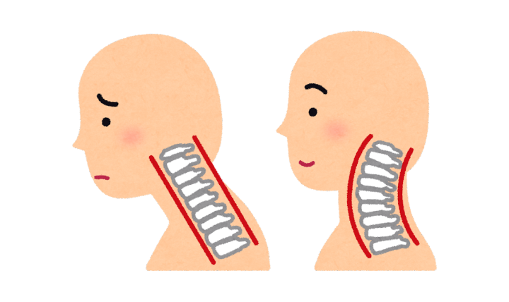 本来、首の骨(頸椎)は緩やかなカーブを描いてこの重さを分散していますが、PCを覗き込むように顔を前に突き出すとカーブが失われ「ストレートネック」になります。