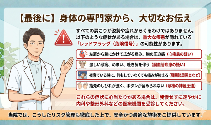 最後に、身体の専門家として大切なお伝えがあります。すべての肩こりが姿勢や疲れからくるわけではありません。以下のような症状がある場合は、重大な疾患が隠れている「レッドフラッグ(危険信号)」の可能性があります。