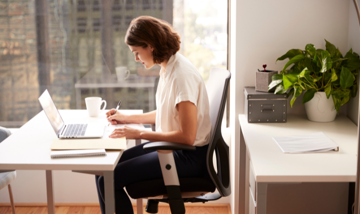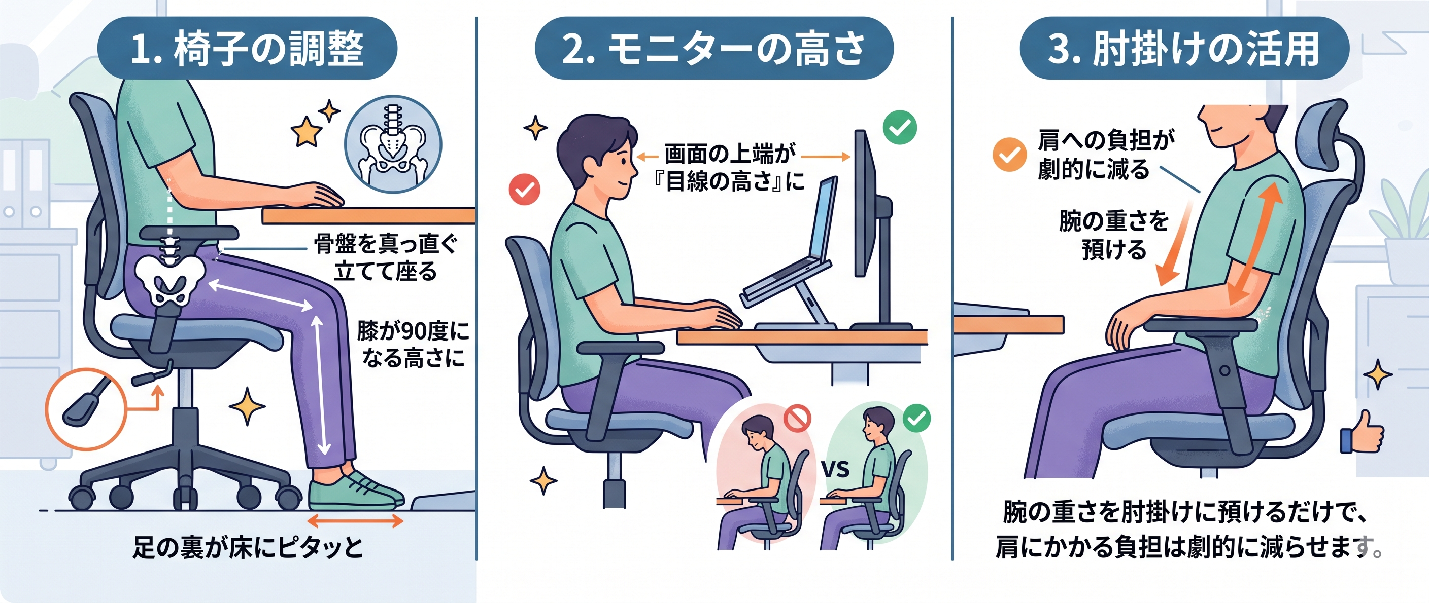 ・椅子の調整: 足の裏が床にピタッとつき、膝が90度になる高さに。骨盤を真っ直ぐ立てて座りましょう。